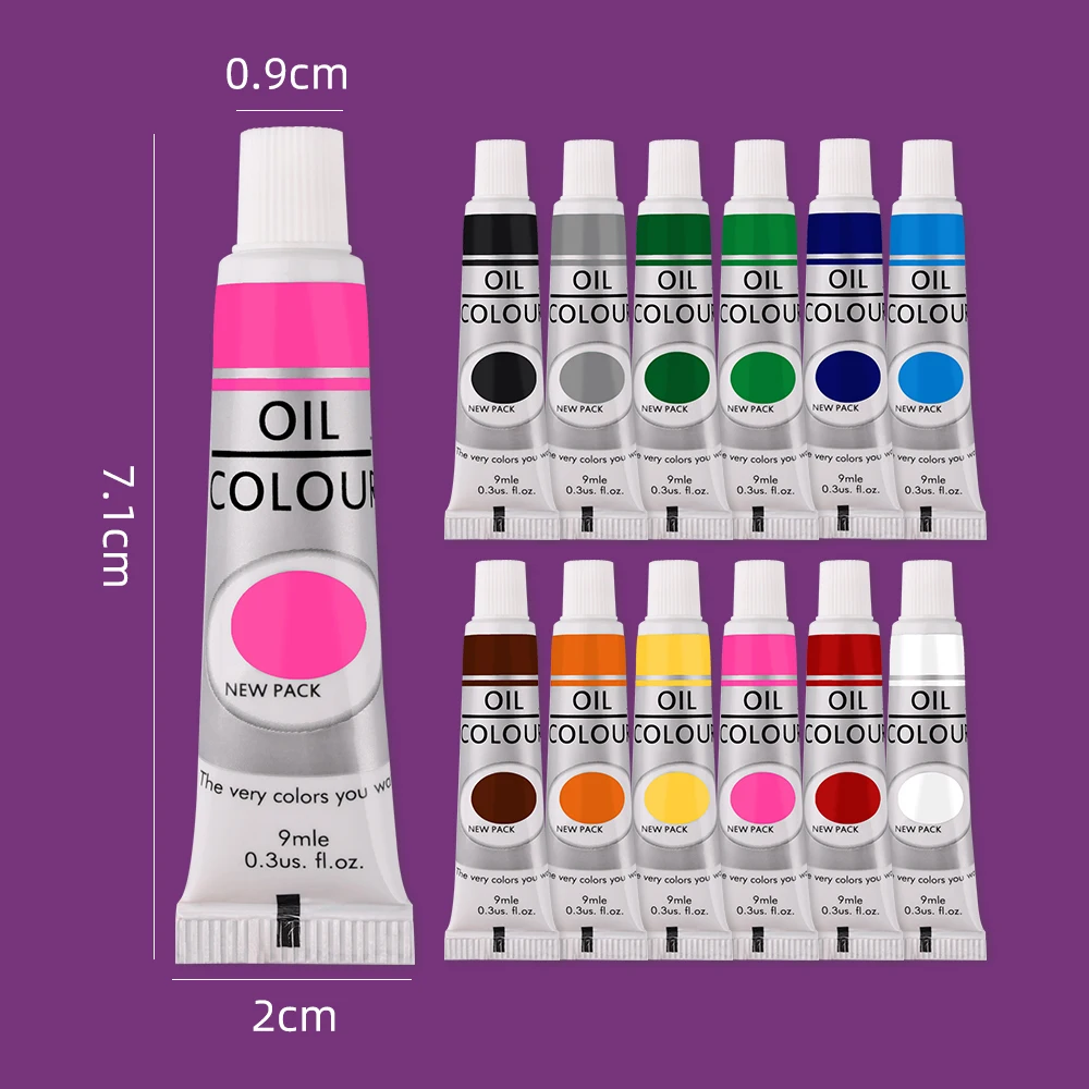 This 12-Color Oil Paint Set includes 9ml tubes designed for students, beginners, and creative hobbyists. The paints offer smooth consistency and rich pigmentation, making them easy to apply and blend on canvas and other surfaces. With waterproof properties once dry, they help ensure long-lasting artwork with vibrant color retention. Ideal for canvas painting, graffiti-style art, fine art projects, and DIY crafts, the set supports a wide range of creative applications. The compact tube size allows for easy handling and controlled paint usage. These oil paints mix well to create custom shades and smooth gradients. Suitable for practice, learning, and creative exploration, they help build confidence in oil painting techniques. A practical and versatile starter set for artistic expression.